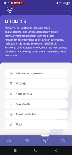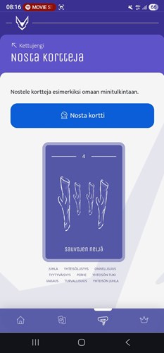 Äppihän pitää sisällään jo aika paljon muutakin kuin tulkintoja. Olen tehnyt sinne ensimmäisen version omista korteistani, sen lisäksi voit nostella päivän kortteja, tutustua kortteihin ja itseasiassa tehdä myöskin virtuaalikorteilla tulkintoja.